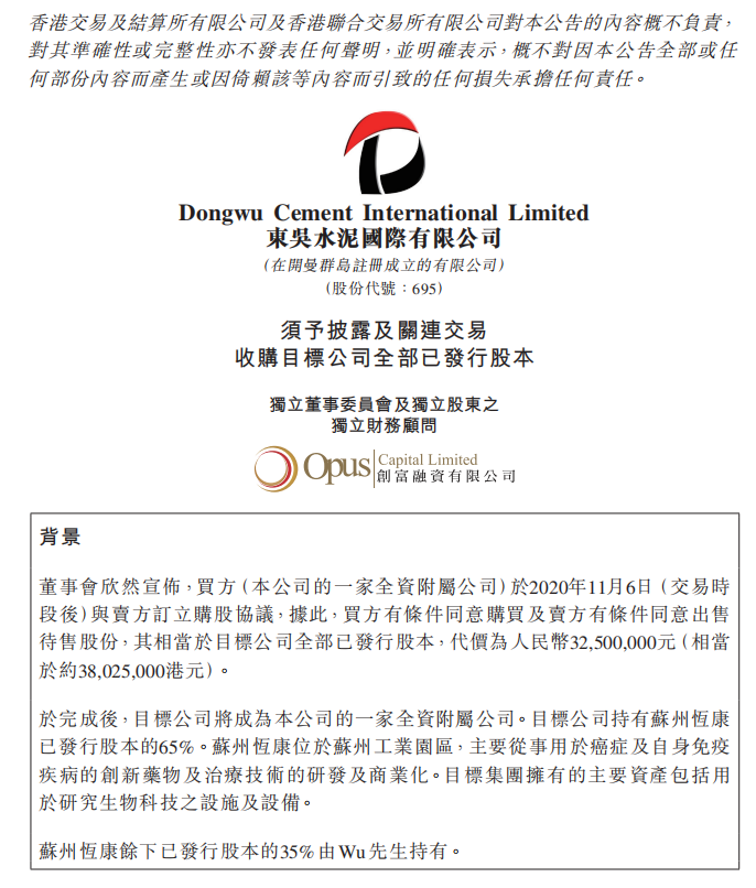 于完成后,目標公司將成為公司的一家全資附屬公司。目標公司持有蘇州恒康已發(fā)行股本的65%,蘇州恒康余下已發(fā)行股本的35%由Wu Jiong先生持有。蘇州恒康位于蘇州工業(yè)園區(qū),主要從事用于癌癥及自身免疫疾病的創(chuàng)新藥物及治療技術(shù)的研發(fā)及商業(yè)化。