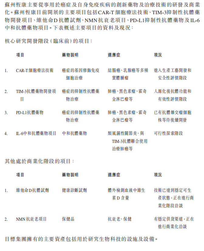 目標集團(目標公司及蘇州恒康)擁有的主要資產(chǎn)包括用于研究生物科技的設(shè)施及設(shè)備。