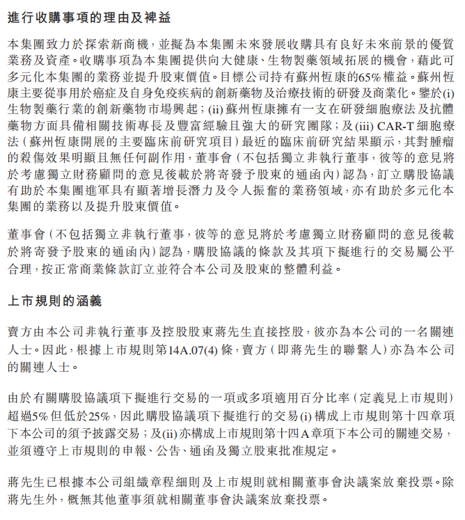 鑒于:生物制藥行業(yè)的創(chuàng)新藥物市場興起;蘇州恒康擁有一支在研發(fā)細胞療法及抗體藥物方面具備相關(guān)技術(shù)專長及豐富經(jīng)驗且強大的研究團隊;及CAR-T 細胞療法(蘇州恒康開展的主要臨床前研究項目)最近的臨床前研究結(jié)果顯示,其對腫瘤的殺傷效果明顯且無任何副作用,董事會認為,訂立購股協(xié)議有助于集團進軍具有顯著增長潛力及令人振奮的業(yè)務(wù)領(lǐng)域,亦有助于多元化集團的業(yè)務(wù)以及提升股東價值。
