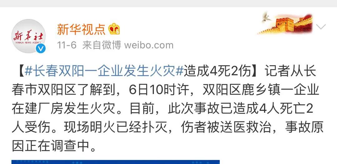 11月6日10時(shí)許,吉林省長(zhǎng)春市雙陽(yáng)區(qū)鹿鄉(xiāng)鎮(zhèn)一企業(yè)在建廠(chǎng)房發(fā)生火災(zāi)。目前,此次事故已造成4人死亡2人受傷?,F(xiàn)場(chǎng)明火已經(jīng)撲滅,傷者被送醫(yī)救治,事故原因正在調(diào)查中。