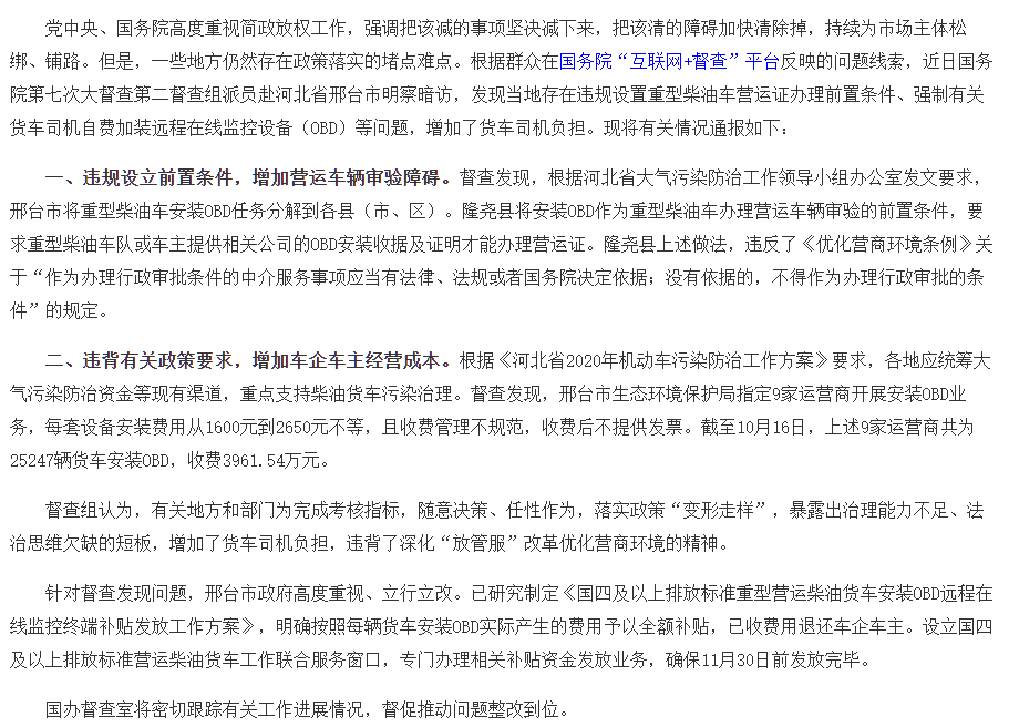 根據《河北省2020年機動車污染防治工作方案》要求,各地應統籌大氣污染防治資金等現有渠道,重點支持柴油貨車污染治理。督查發(fā)現,邢臺市生態(tài)環(huán)境保護局指定9家運營商開展安裝OBD業(yè)務,每套設備安裝費用從1600元到2650元不等,且收費管理不規(guī)范,收費后不提供發(fā)票。截至10月16日,上述9家運營商共為25247輛貨車安裝OBD,收費3961.54萬元。督查組認為,有關地方和部門為完成考核指標,隨意決策、任性作為,落實政策“變形走樣”,暴露出治理能力不足、法治思維欠缺的短板,增加了貨車司機負擔,違背了深化“放管服”改革優(yōu)化營商環(huán)境的精神。針對督查發(fā)現問題,邢臺市政府高度重視、立行立改。已研究制定《國四及以上排放標準重型營運柴油貨車安裝OBD遠程在線監(jiān)控終端補貼發(fā)放工作方案》,明確按照每輛貨車安裝OBD實際產生的費用予以全額補貼,已收費用退還車企車主。設立國四及以上排放標準營運柴油貨車工作聯合服務窗口,專門辦理相關補貼資金發(fā)放業(yè)務,確保11月30前發(fā)放完畢。國辦督查室將密切跟蹤有關工作進展情況,督促推動問題整改到位。