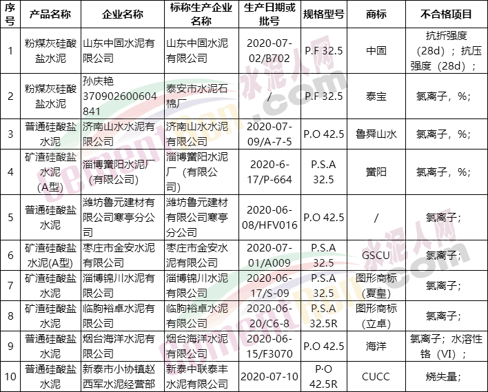 山東省市場(chǎng)監(jiān)督管理局網(wǎng)站公布2020年水泥產(chǎn)品質(zhì)量省級(jí)監(jiān)督抽查結(jié)果。共抽查了全省361家企業(yè)373批次水泥產(chǎn)品,其中,生產(chǎn)領(lǐng)域280家企業(yè)281批次,流通領(lǐng)域81家企業(yè)92批次。發(fā)現(xiàn)10家企業(yè)的10批次產(chǎn)品不符合相關(guān)標(biāo)準(zhǔn)的要求,不合格項(xiàng)目為氯離子、燒失量、28d強(qiáng)度、水泥溶性鉻(VI)項(xiàng)目。本次抽查依據(jù)GB 175-2007《通用硅酸鹽水泥》、GB31893-2015《水泥中水泥溶性鉻(VI)的限量及測(cè)定方法》、GB6566-2010《建筑材料放射性核素限量》等標(biāo)準(zhǔn)的要求,對(duì)水泥產(chǎn)品的三氧化硫、氧化鎂、燒失量、氯離子、凝結(jié)時(shí)間、安定性、強(qiáng)度、水溶性鉻(VI)、放射性等9個(gè)項(xiàng)目進(jìn)行了檢驗(yàn)。