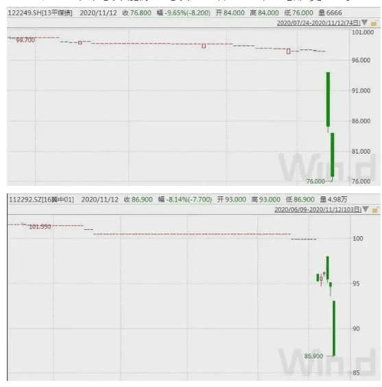 其他煤企債券也被帶崩,平煤股份“13平煤債”連續(xù)兩日下跌,跌9.65%報76.8元,冀中能源“16冀中01”跌8.14%,均創(chuàng)歷史新低。