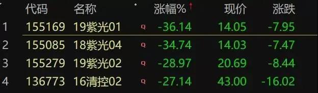 11月12日,紫光集團存續(xù)債全線大跌30%左右,三只債券盤中二次臨停,百元面值債券報價僅14元。