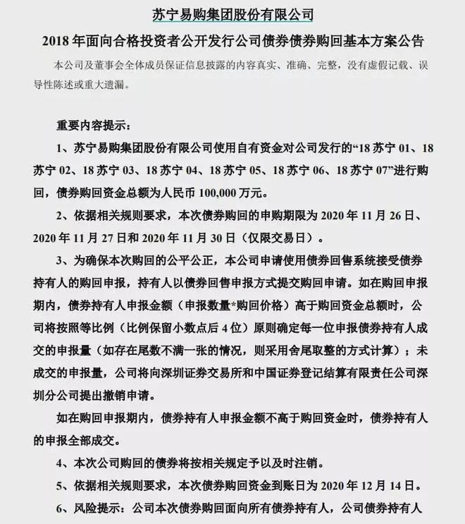 蘇寧易購周四晚間公告稱,使用自有資金對公司發(fā)行的“18蘇寧01”、“18蘇寧02”、“18蘇寧03”、“18蘇寧04”、“18蘇寧05”、“18蘇寧06”、“18蘇寧07”進行購回,債券購回資金總額為10億元。本次債券購回的申購期限為11月26日、11月27日和11月30日(僅限交易日)