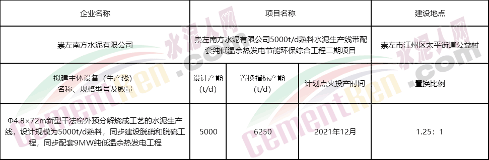 日前,廣西壯族自治區(qū)工業(yè)和信息化廳發(fā)布了廣西崇左南方水泥有限公司日產(chǎn)5000噸熟料水泥生產(chǎn)線項(xiàng)目產(chǎn)能置換方案公示。公示文件顯示,新建生產(chǎn)線產(chǎn)能指標(biāo)分別來(lái)自江山南方水泥有限公司、汪清北方水泥有限公司和新疆屯河水泥有限責(zé)任公司3家企業(yè),新建生產(chǎn)線將于2021年12月點(diǎn)火投產(chǎn)。