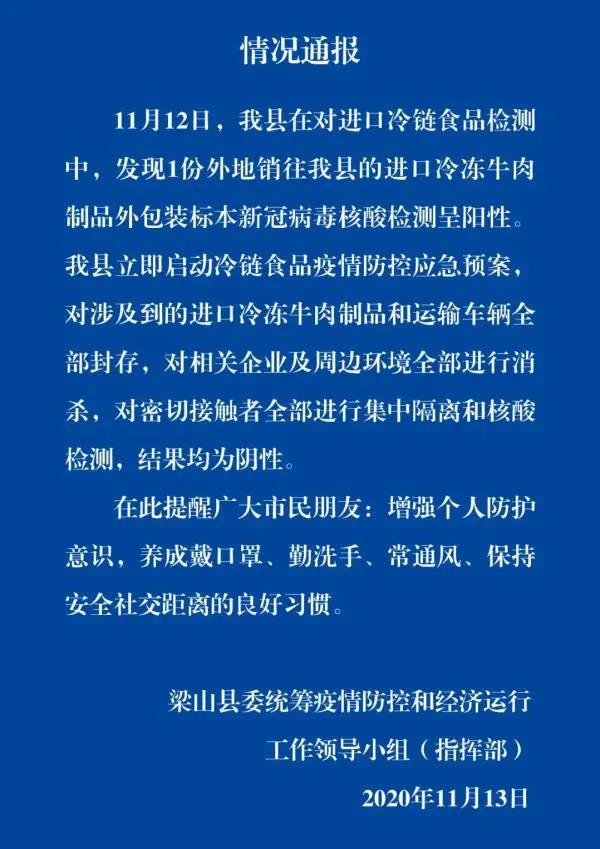 11月12日,山東濟寧梁山縣在對進口冷鏈?zhǔn)称窓z測中,發(fā)現(xiàn)1份外地銷往梁山縣的進口冷凍牛肉制品外包裝標(biāo)本新冠病毒核酸檢測呈陽性。