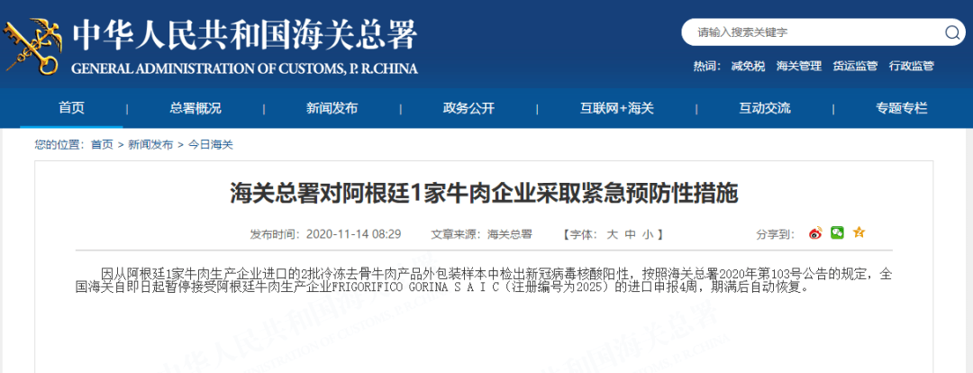 海關(guān)總署今天發(fā)布消息稱,因從阿根廷1家牛肉生產(chǎn)企業(yè)進口的2批冷凍去骨牛肉產(chǎn)品外包裝樣本中檢出新冠病毒核酸陽性,按照海關(guān)總署2020年第103號公告的規(guī)定,全國海關(guān)自即日起暫停接受阿根廷牛肉生產(chǎn)企業(yè)FRIGORIFICO GORINA S A I C(注冊編號為2025)的進口申報4周,期滿后自動恢復(fù)。