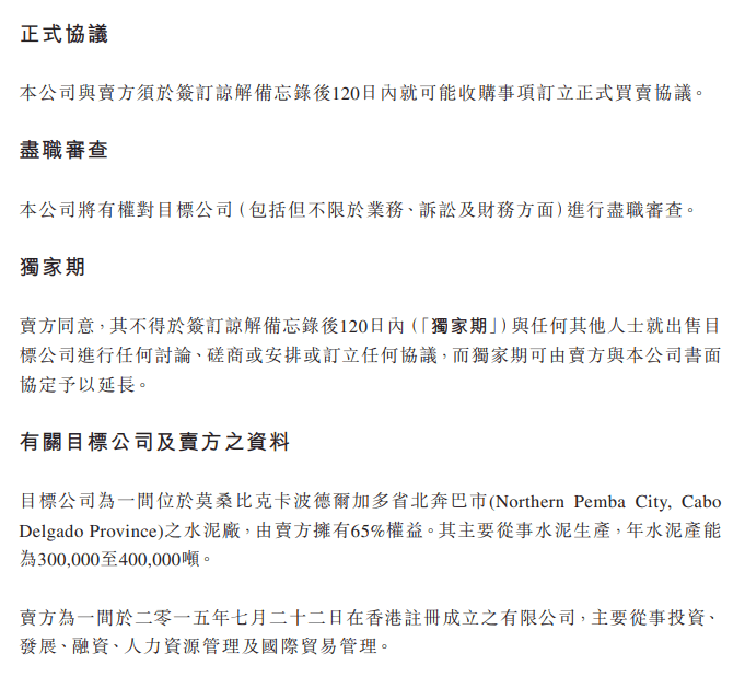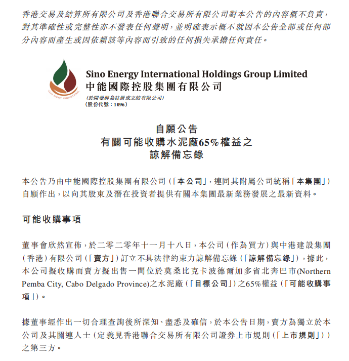智通財(cái)經(jīng)APP訊,中能國(guó)際控股(01096)發(fā)布公告,于2020年11月18日,公司(買方)與中港建設(shè)集團(tuán)(香港)有限公司(賣方)訂立不具法律約束力諒解備忘錄,公司擬收購(gòu)一間位于莫桑比克卡波德爾加多省北奔巴市(Northern Pemba City, Cabo Delgado Province)的水泥廠(目標(biāo)公司)的65%權(quán)益。
