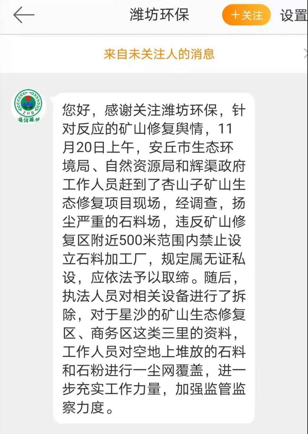 此事經(jīng)媒體報道后,山東濰坊生態(tài)環(huán)境局21日回復(fù):11月20日上午,安丘市生態(tài)環(huán)境局、自然資源局和輝渠政府工作人員趕到了杏山子礦山生態(tài)修復(fù)項目現(xiàn)場,經(jīng)調(diào)查,揚塵嚴(yán)重的石料場,違反礦山修復(fù)區(qū)附近500米范圍內(nèi)禁止設(shè)立石料加工廠,規(guī)定屬無證私設(shè),應(yīng)依法予以取締。隨后,執(zhí)法人員對相關(guān)設(shè)備進(jìn)行了拆除,對于星沙的礦山生態(tài)修復(fù)區(qū)、商務(wù)區(qū)這類三里的資料,工作人員對空地上堆放的石料和石粉進(jìn)行一塵網(wǎng)覆蓋,進(jìn)一步充實工作力量,加強(qiáng)監(jiān)管監(jiān)察力度。