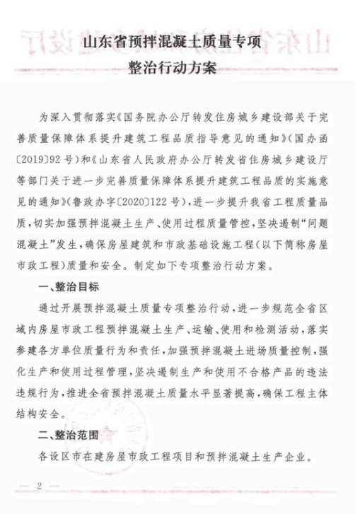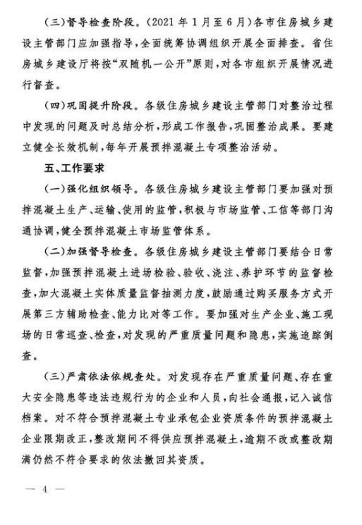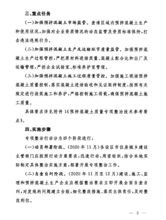 僅過月余,11月6日,省住建廳再次印發(fā)關于《山東省預拌混凝土質量專項整治行動方案》的通知,對于預拌混凝土專項整治工作給出具體的重點任務、實施步驟以及工作要求。通知要求在全省各設區(qū)市范圍,從混凝土的市場監(jiān)管、生產及運輸環(huán)節(jié)、施工過程進行全方位督導檢查。專項整治行動分四個階段進行,2020年11月動員部署,11月至12月,在為期一個月的時間內自查自糾,2021年1月至6月督導檢查,最后階段為鞏固提升。