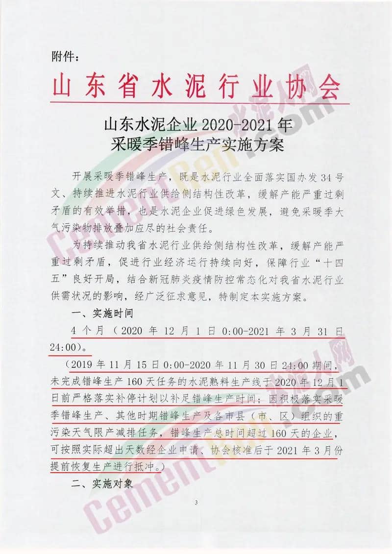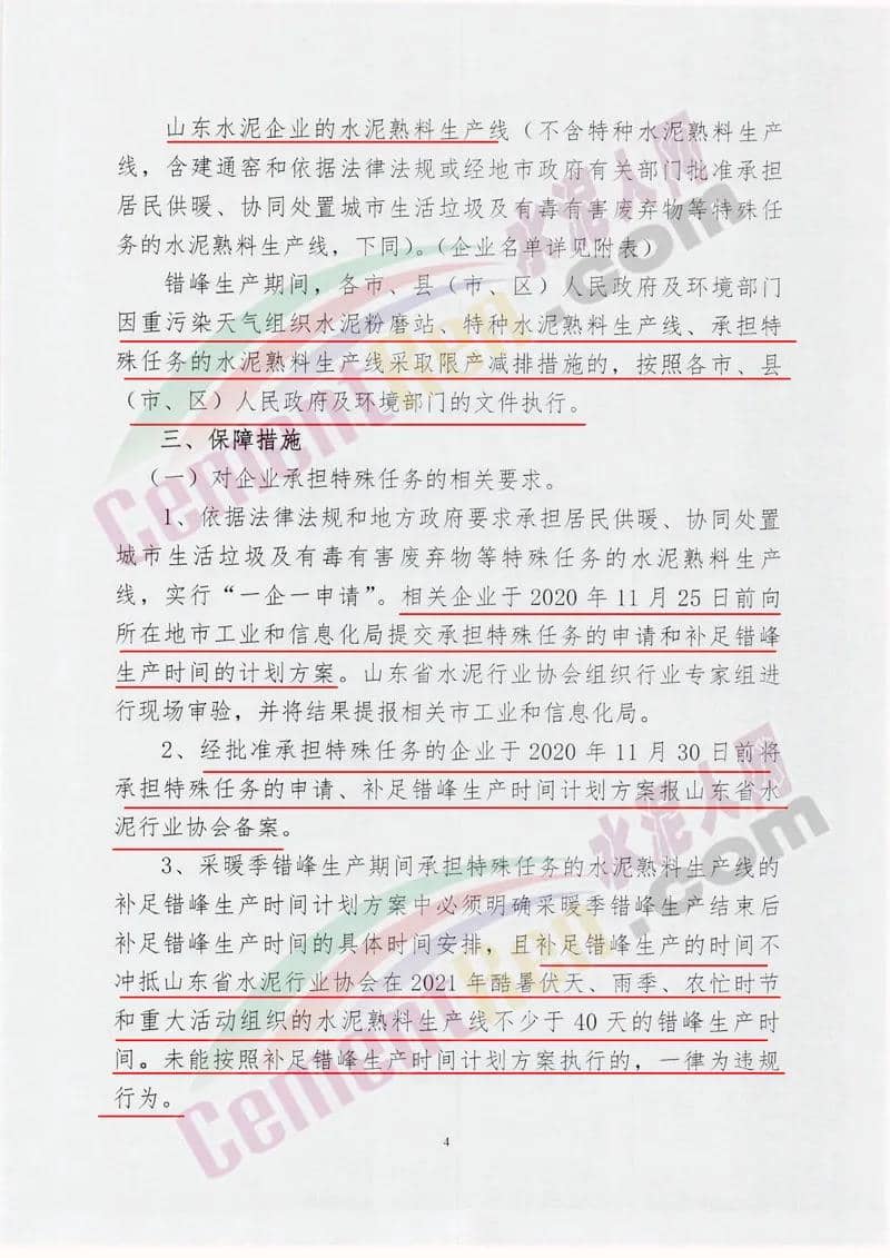 2、經(jīng)批準(zhǔn)承擔(dān)特殊任務(wù)的企業(yè)于2020年11月30日前將 承擔(dān)特殊任務(wù)的申請(qǐng)、補(bǔ)足錯(cuò)峰生產(chǎn)時(shí)間計(jì)劃方案報(bào)山東省水泥行業(yè)協(xié)會(huì)備案。