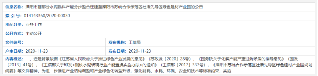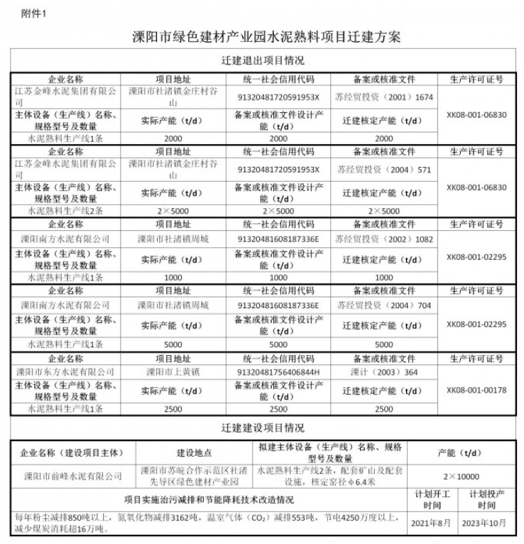 溧陽市轄部分水泥熟料產(chǎn)能分步整合遷建