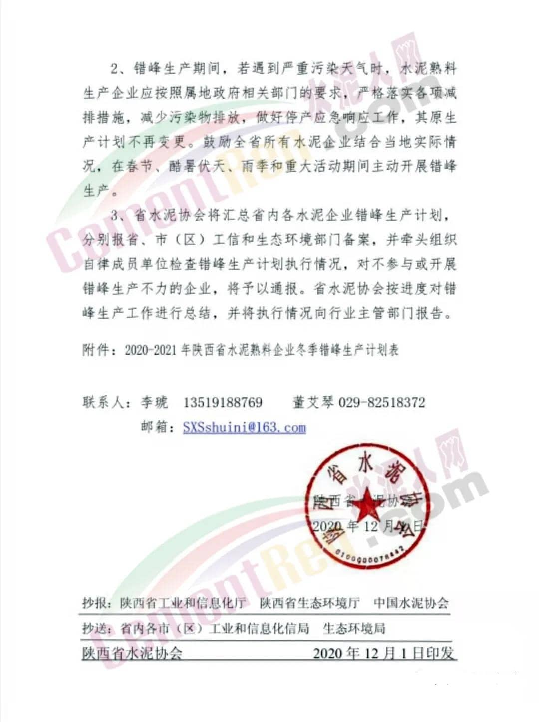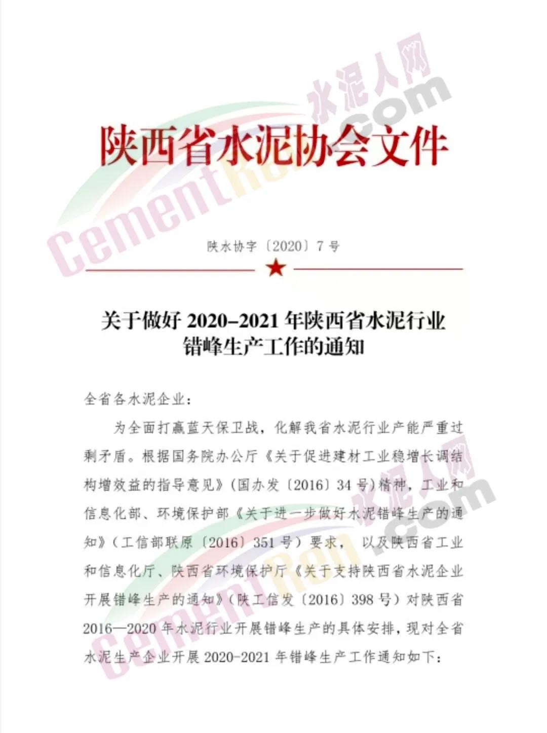 一、錯峰生產(chǎn)時間2020年12月10日—--2021年2月28日(冬季錯峰生產(chǎn)80天),7月——9月(夏季錯峰生產(chǎn)30天)二、實施范圍關(guān)中地區(qū),所有水泥熟料生產(chǎn)線全部實行冬季錯峰生產(chǎn)80天,夏季錯峰生產(chǎn)30天。確有必要承擔(dān)居民供暖、協(xié)同處置城市生活垃圾及有毒有害廢棄物等任務(wù)的生產(chǎn)線,要核定最低生產(chǎn)負(fù)荷和運(yùn)行時間,并要在非采暖季和非錯峰生產(chǎn)期間補(bǔ)足錯峰時間。陜北地區(qū),所有水泥熟料生產(chǎn)線參照關(guān)中地區(qū)錯峰生產(chǎn)方案執(zhí)行,利用電石渣生產(chǎn)水泥熟料企業(yè),應(yīng)核定最低生產(chǎn)負(fù)荷,錯峰時間不足的,應(yīng)通過與當(dāng)?shù)胤请娛a(chǎn)企業(yè)"錯峰置換"或采取在非采暖季、非錯峰生產(chǎn)時間補(bǔ)足錯峰時間的辦法參與錯峰生產(chǎn),全年錯峰時間不少于100天。陜南地區(qū),屬非采暖地區(qū),所有水泥熟料生產(chǎn)線應(yīng)嚴(yán)格按照屬地政府相關(guān)部門的要求,降低生產(chǎn)負(fù)荷,參照關(guān)中地區(qū)制定錯峰生產(chǎn)方案。三、保障措施1、各水泥熟料生產(chǎn)企業(yè)要切實做好冬季錯峰生產(chǎn)計劃工作。確有必要承擔(dān)居民供暖、協(xié)同處置城市生活垃圾及有毒有害廢棄物等任務(wù)的生產(chǎn)線,務(wù)必于12月10日前將錯峰生產(chǎn)計劃報省水泥協(xié)會。錯峰生產(chǎn)期間生產(chǎn)的水泥熟料應(yīng)以滿足本地需求為主,嚴(yán)禁跨區(qū)域傾銷,破壞其它地區(qū)錯峰生產(chǎn)工作。2、錯峰生產(chǎn)期間,若遇到嚴(yán)重污染天氣時,水泥熟料生產(chǎn)企業(yè)應(yīng)按照屬地政府相關(guān)部門的要求,嚴(yán)格落實各項減排措施,減少污染物排放,做好停產(chǎn)應(yīng)急響應(yīng)工作,其原生產(chǎn)計劃不再變更。鼓勵全省所有水泥企業(yè)結(jié)合當(dāng)?shù)貙嶋H情況,在春節(jié)、酷暑伏天、雨季和重大活動期間主動開展錯峰生產(chǎn)。3、省水泥協(xié)會將匯總省內(nèi)各水泥企業(yè)錯峰生產(chǎn)計劃,分別報省、市(區(qū))工信和生態(tài)環(huán)境部門備案,并牽頭組織自律成員單位檢查錯峰生產(chǎn)計劃執(zhí)行情況,對不參與或開展錯峰生產(chǎn)不力的企業(yè),將予以通報。省水泥協(xié)會按進(jìn)度對錯峰生產(chǎn)工作進(jìn)行總結(jié),并將執(zhí)行情況向行業(yè)主管部門報告。通知原文如下: