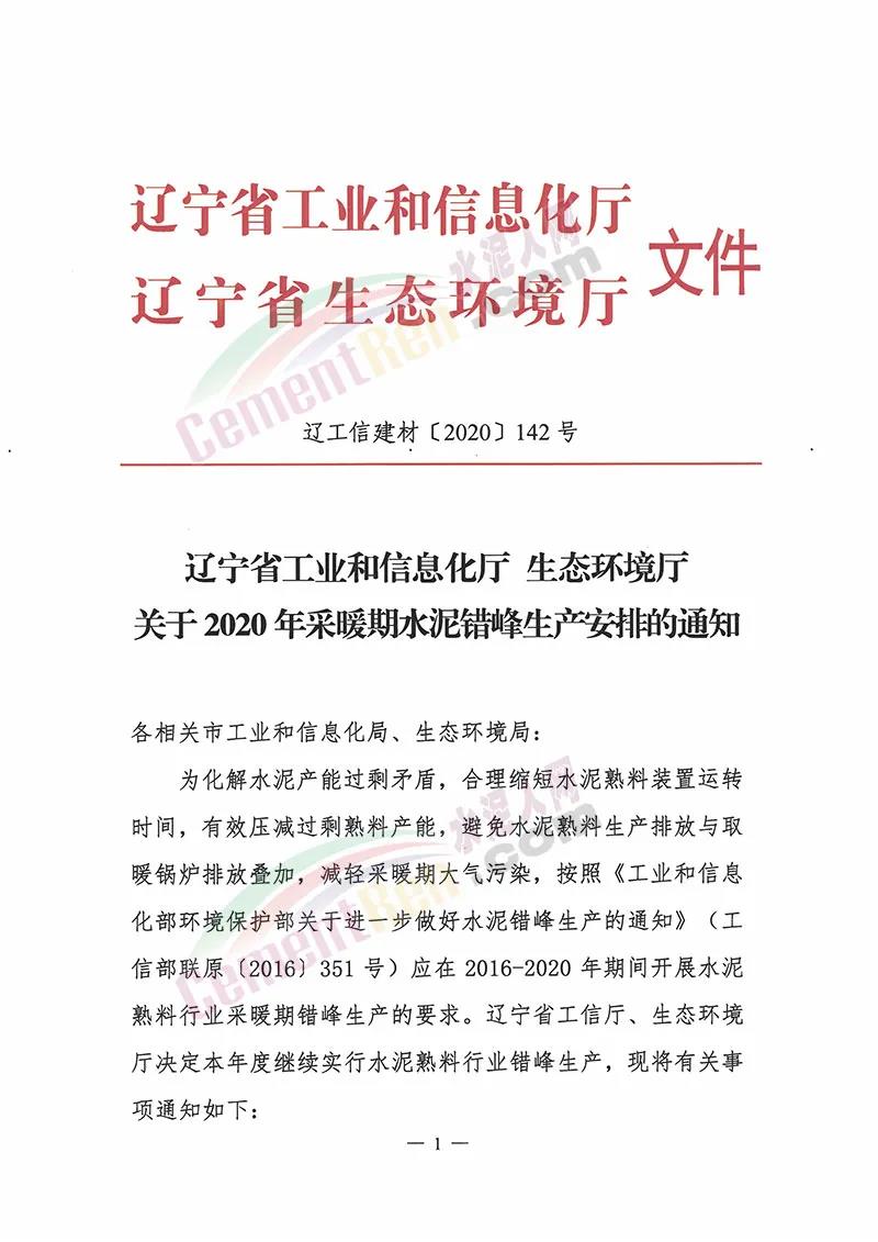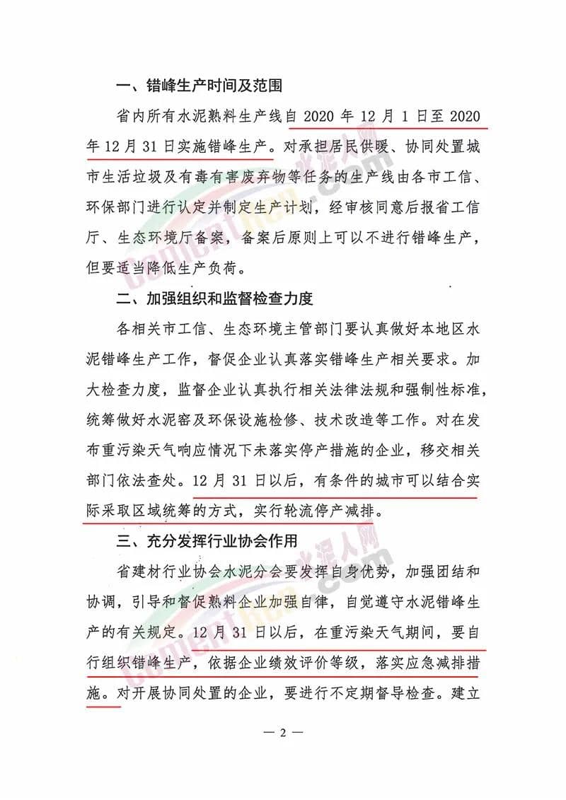 省內(nèi)所有水泥熟料生產(chǎn)線自2020年12月1日至2020年12月31日實(shí)施錯(cuò)峰生產(chǎn)。對(duì)承擔(dān)居民供暖、協(xié)同處置城市生活垃圾及有毒有害廢棄物等任務(wù)的生產(chǎn)線由各市工信、環(huán)保部門進(jìn)行認(rèn)定并制定生產(chǎn)計(jì)劃,經(jīng)審核同意后報(bào)省工信廳、生態(tài)環(huán)境廳備案,備案后原則上可以不進(jìn)行錯(cuò)峰生產(chǎn),但要適當(dāng)降低生產(chǎn)負(fù)荷。