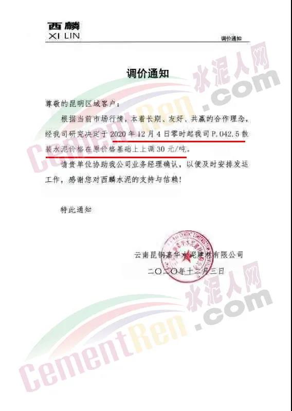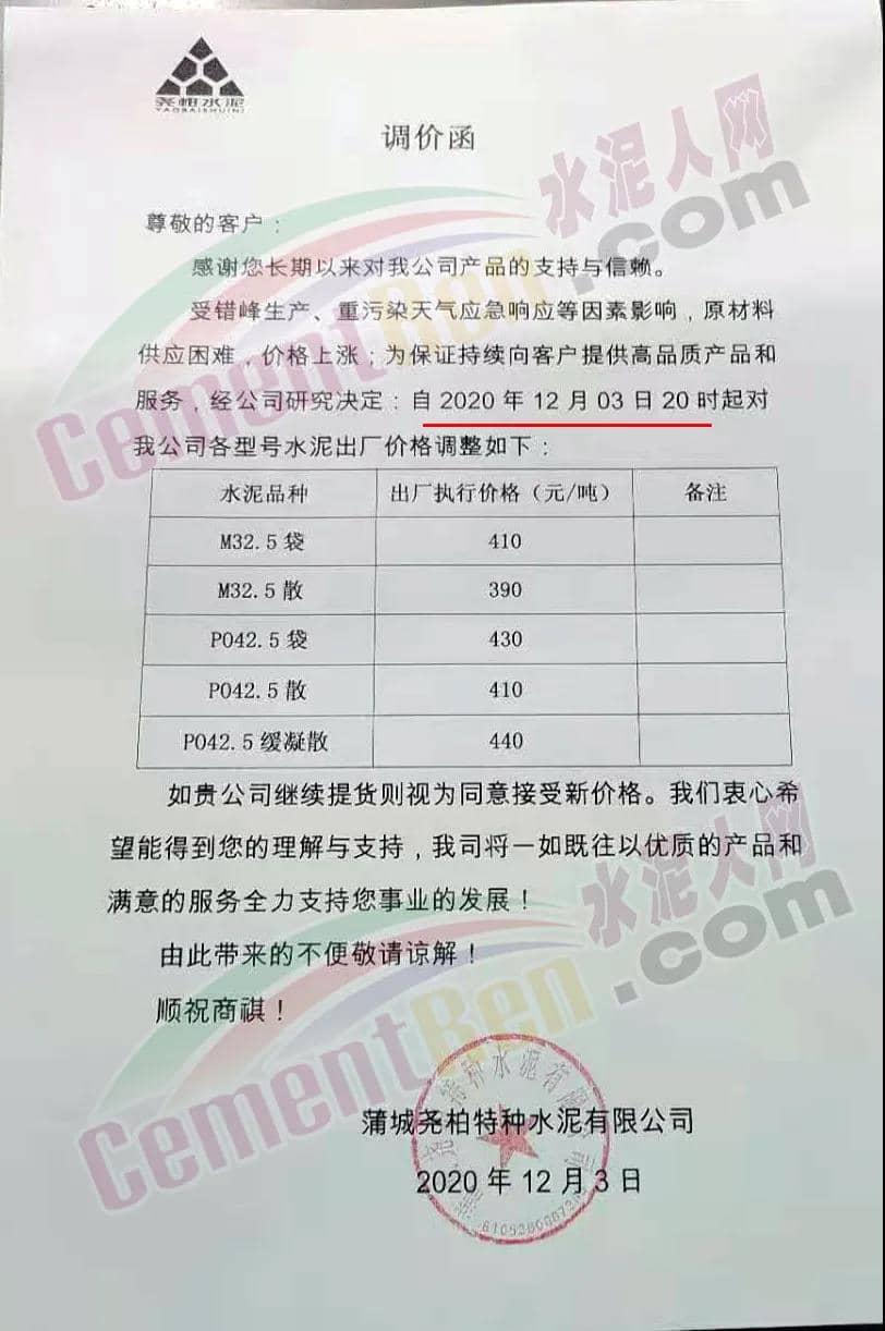 我公司從2020年12月3日14時(shí)起,針對P.O42.5散裝水泥產(chǎn)品出廠價(jià)調(diào)整至最低405元/噸,其他產(chǎn)品在原價(jià)格基礎(chǔ)上上調(diào)60元/噸。