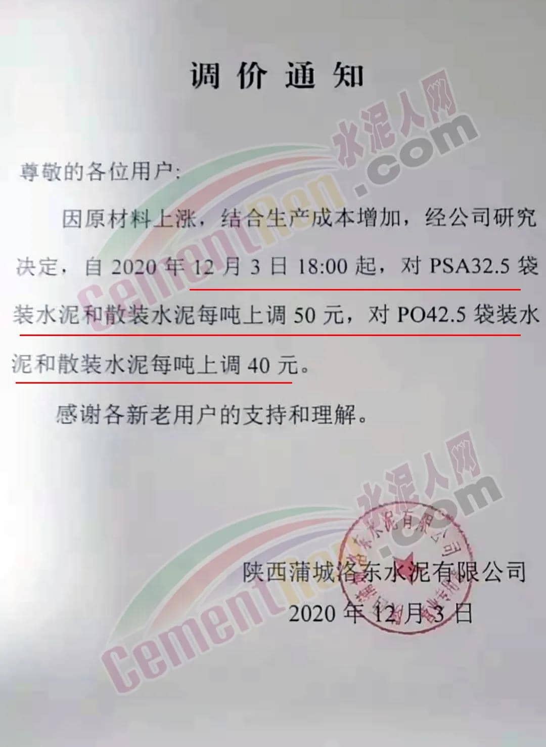蒲城洛東水泥通知自12月3日下午18時(shí)起,對PSA32.5袋裝水泥有散裝水泥上調(diào)50元/噸,對PO42.5袋裝水泥和散裝水泥上調(diào)40元/噸。