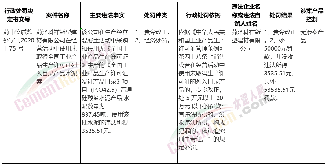 日前,山東菏澤市市場監(jiān)督局發(fā)布一則行政處罰信息。處罰案件為菏澤科祥新型建材有限公司在生產(chǎn)經(jīng)營混凝土活動中采購和使用無證生產(chǎn)企業(yè)生產(chǎn)的P.O42.5水泥。