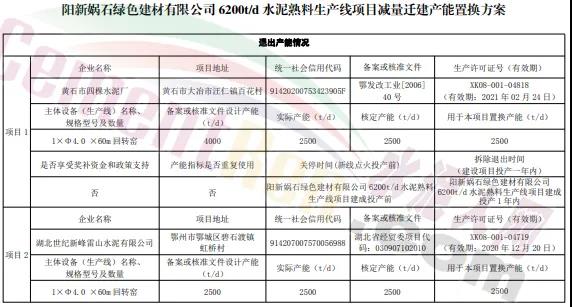 從公示方案可見,陽新媧石綠色建材有限公司將在湖北陽新經(jīng)濟(jì)技術(shù)開發(fā)區(qū)濱江工業(yè)園內(nèi)新建1條6200t/d水泥熟料生產(chǎn)線(φ5.2m×82m回轉(zhuǎn)窯1條)設(shè)計產(chǎn)能186萬噸/年,計劃在2022 年 12 月 31 日點火投產(chǎn)。置換方案如下: