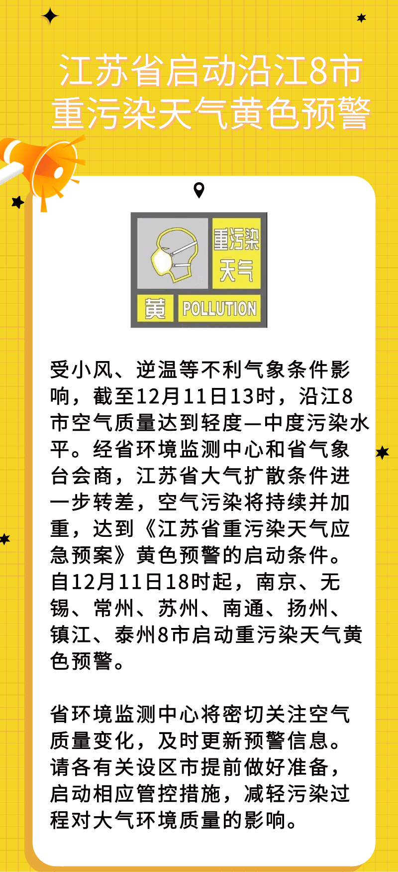 受小風(fēng)、逆溫等不利氣象條件影響,截至12月11日13時,沿江8市空氣質(zhì)量達(dá)到輕度-中度污染水平。經(jīng)省環(huán)境監(jiān)測中心和省氣象臺會商,江蘇省大氣擴(kuò)散條件進(jìn)一步轉(zhuǎn)差,空氣污染將持續(xù)并加重,達(dá)到《江蘇省重污染天氣應(yīng)急預(yù)案》黃色預(yù)警的啟動條件。自12月11日18時起,南京、無錫、常州、蘇州、南通、揚(yáng)州、鎮(zhèn)江、泰州8市啟動重污染天氣黃色預(yù)警。