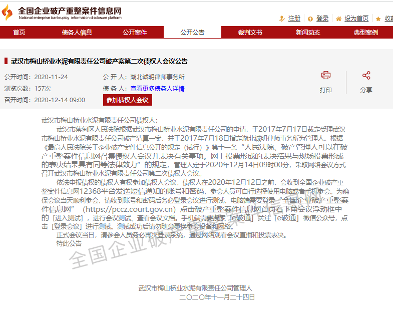 三、武漢市梅山橋業(yè)水泥有限責(zé)任公司破產(chǎn)案第二次債權(quán)人會議
