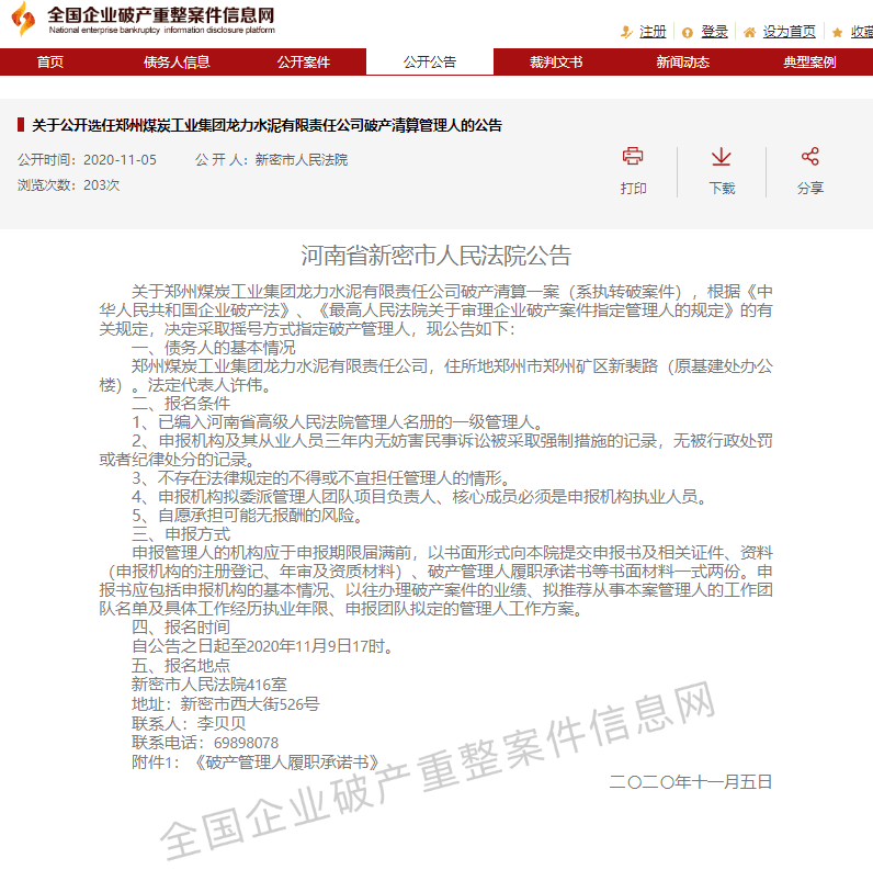 四、關(guān)于公開選任鄭州煤炭工業(yè)集團龍力水泥有限責(zé)任公司破產(chǎn)清算管理人