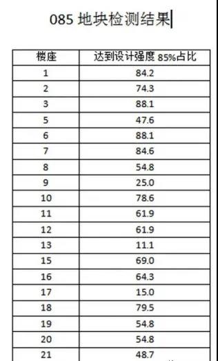 據(jù)業(yè)主提供的溝通會(huì)現(xiàn)場(chǎng)視頻資料顯示,青島國(guó)科健康科技小鎮(zhèn)85地塊9、13、17號(hào)三棟樓混凝土整體強(qiáng)度較低,其他樓棟局部構(gòu)件不滿足混凝土強(qiáng)度設(shè)計(jì)要求。