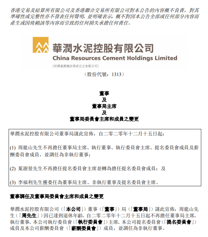 華潤水泥控股(01313)公布,周龍山不再擔(dān)任董事局主席、執(zhí)行董事、執(zhí)行委員會主席、提名委員會成員及薪酬委員會成員,并調(diào)任為非執(zhí)行董事;