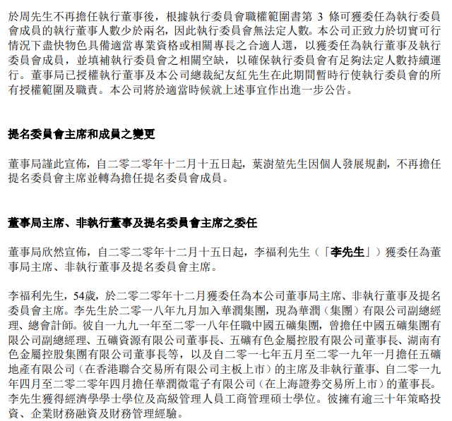 葉澍堃不再擔(dān)任提名委員會主席并轉(zhuǎn)為擔(dān)任提名委員會成員;同時(shí),李福利獲委任為董事局主席、非執(zhí)行董事及提名委員會主席。以上人事變動均自2020年12月15日起。