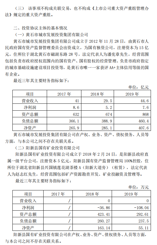公司與黃石市城市發(fā)展投資集團有限公司、陽新縣國有礦業(yè)投資有限公司于2020年12月14日簽署了《合作協(xié)議》。