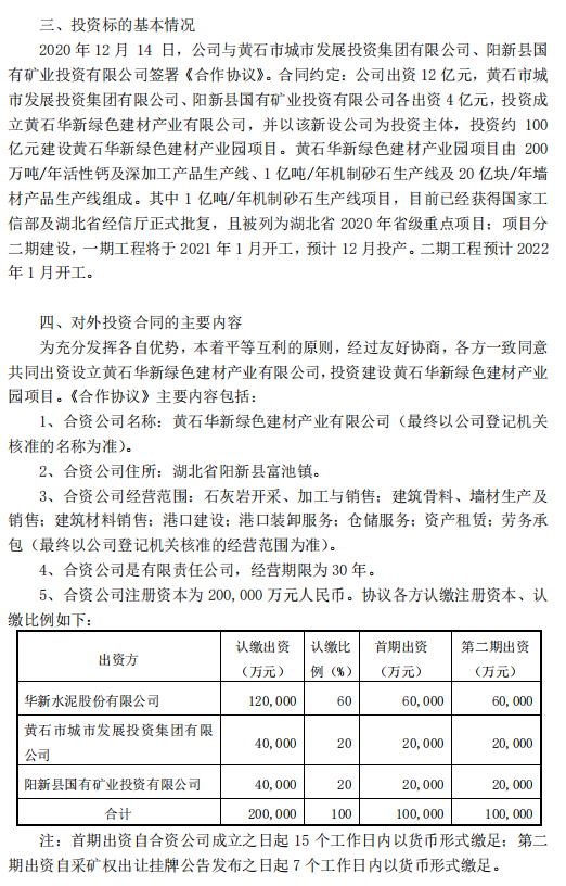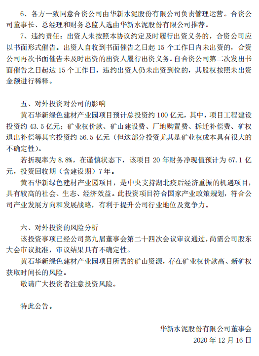 按出資比例,公司在黃石華新綠色建材產(chǎn)業(yè)園項目總投資約100億元中的投資資產(chǎn)約60億元,達(dá)到了公司最近一期經(jīng)審計的母公司凈資產(chǎn)122.8億元的49%,因此該投資事項尚需公司股東大會審議批準(zhǔn)。