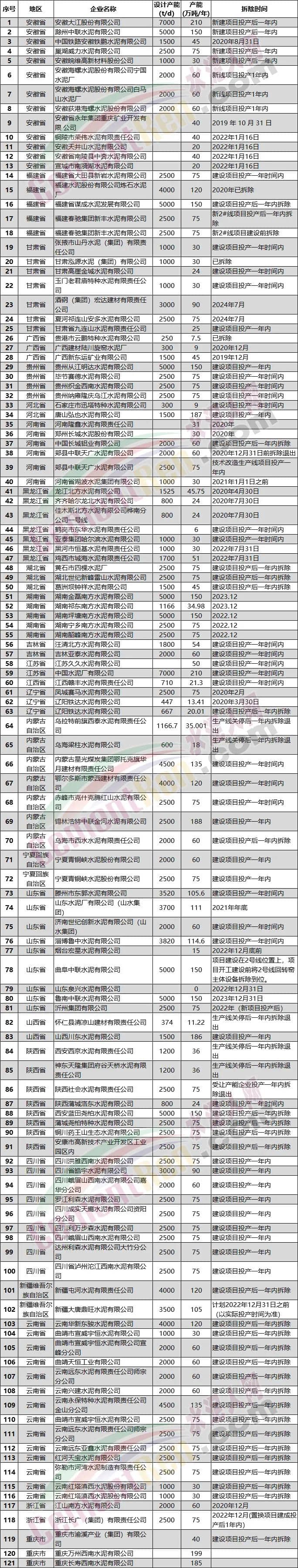 部分淘汰水泥生產線拆除時間表