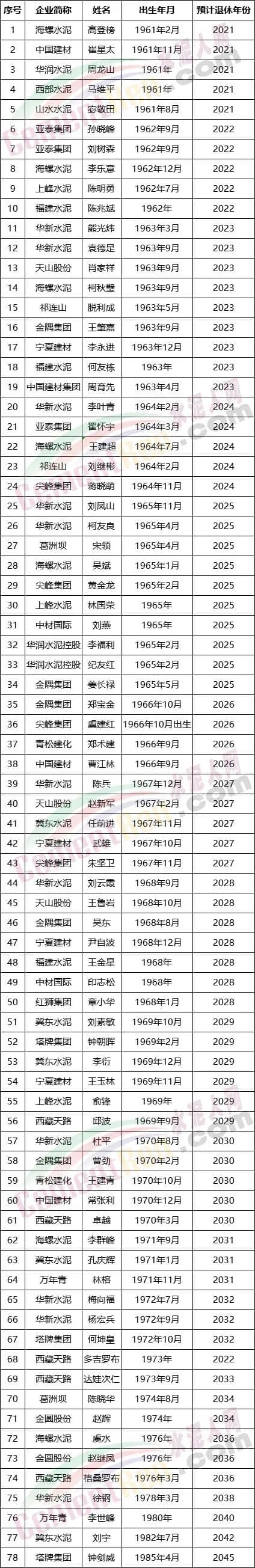 據(jù)水泥人網(wǎng)不完全統(tǒng)計78位上市企業(yè)高管中有34位將于5年內(nèi)到退休年齡。其中海螺水泥總工李樂意2022年到退休年齡,祁連山水泥董事長脫利成、華新水泥南部事業(yè)部總裁熊光煒、湖北西部事業(yè)部總裁袁德足、天山股份肖家祥、海螺水泥柯秋璧2023年到退休年齡, 華新水泥總裁李葉青、尖峰集團董事長蔣曉萌、海螺水泥副董事長王建超、亞泰集團翟懷宇、祁連山水泥總裁劉繼彬2024年到退休年齡... ...