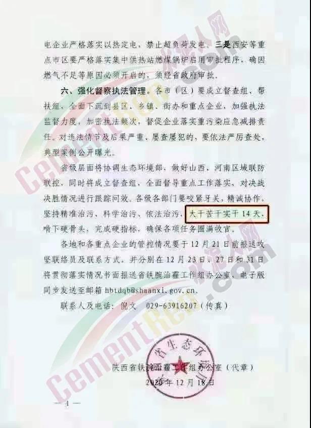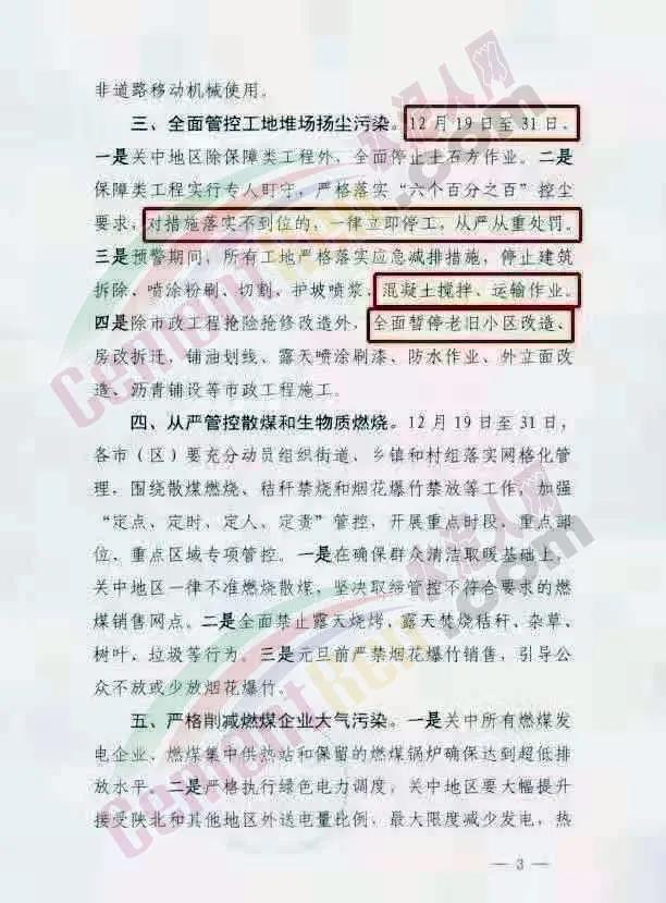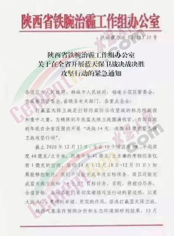 同期,陜西省鐵腕治霾工作組辦公室發(fā)布《關(guān)于在全省開展藍天保衛(wèi)戰(zhàn)決戰(zhàn)決勝攻堅的緊急通知》稱12月18日陜西省重污染天氣應(yīng)急指揮部辦公室已向關(guān)中8市發(fā)布橙色預(yù)警提示,要求重點行業(yè)企業(yè)全面落實錯峰生產(chǎn),12月19日至31日,關(guān)中地區(qū)水泥、耐火材料等建材行業(yè)全部實施停產(chǎn)要求,水泥粉磨站在重污染天氣預(yù)警期間實施停產(chǎn)。陜南、陜北可參照執(zhí)行。源頭管控道路運輸污染,從嚴管控公路貨物運輸,12月2·1日至31日停止燃煤,煤潭及其他物料公路運輸。二是除承擔特殊保障任務(wù)的車輛外,關(guān)中地區(qū)建材、焦化、礦山等重點行業(yè)企業(yè)全面暫停公路運輸原料 、物料。三是保障類工程全面禁止渣土運輸和非道路移動機械使用。12月19日至31日期間,對措施落實不到位的施工工地,一律立即停工,從嚴從重處罰 。