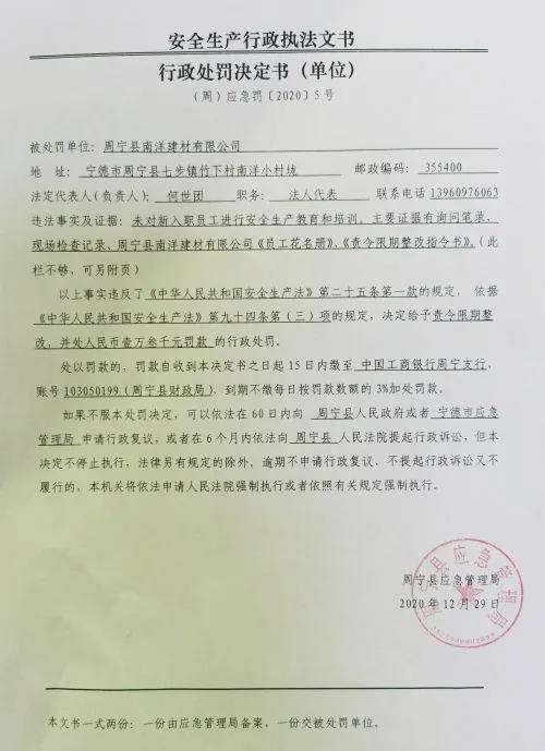 附件:周寧縣應急管理局行政處罰決定書