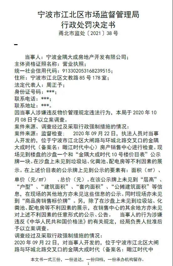 近日,浙江寧波市江北區(qū)市場(chǎng)監(jiān)督管理局對(duì)寧波金隅大成房地產(chǎn)開發(fā)有限公司(以下簡(jiǎn)稱:“金隅大成地產(chǎn)”)罰款27.3萬元,處罰事由為其開發(fā)的金隅大成時(shí)代項(xiàng)目(備案名:瞰江時(shí)代中心)存在未公示或者未完全公示“商品房銷售 標(biāo)價(jià)牌”和“商品房銷售價(jià)目表”銷售商品房的行為,該違法行為違反明碼標(biāo)價(jià)規(guī)定(不按規(guī)定的內(nèi)容和方式明碼標(biāo)價(jià))。行政處罰決定書文號(hào):甬北市監(jiān)處[2021]38號(hào)。