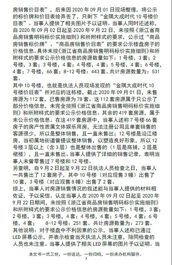 其中10號(hào)樓,也就是執(zhí)法人員現(xiàn)場(chǎng)發(fā)現(xiàn)的“金隅大成時(shí)代10號(hào)樓價(jià)目表”所對(duì)應(yīng)的這棟樓,截止2020年9月01日,未售房源為112套,已售房源為78套。這112套房源屬于只公示了部分價(jià)格信息,未完全按照《浙江省商品房銷售明碼標(biāo)價(jià)實(shí)施細(xì)則》和所附樣式的要求公示價(jià)格信息。其余的419套房源,屬于未公示價(jià)格信息。在這419套房源中,當(dāng)事人述稱7號(hào)樓66套房子的房產(chǎn)性質(zhì)屬文體娛樂用房,無法注冊(cè)公司且單套銷售的客源很少,所以是整體銷售,且一直未售出;12號(hào)樓是沿江樓房,當(dāng)初屬地街道曾提議整體銷售,以塑造良好形象,所以12號(hào)樓3層以上(含3層)也是整體出售的(1層是商鋪,2層是裙樓),且一直未售出。當(dāng)事人提供了詳細(xì)的銷售記錄,表明當(dāng)事人未曾零售過7號(hào)樓和12號(hào)樓。