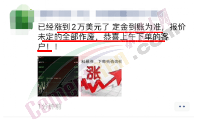 有企業(yè)發(fā)消息稱,暴漲的行情賣貨就跟打仗一樣,搶到就是賺到??!這次真的起飛了,漲勢太迅猛。銷售人員提醒下單的抓點緊呀!開工4天漲4天,今天的高價就是明天的低價,恭喜昨天下單的客戶!你還在猶豫嗎?再不出手就只能拍大腿了!