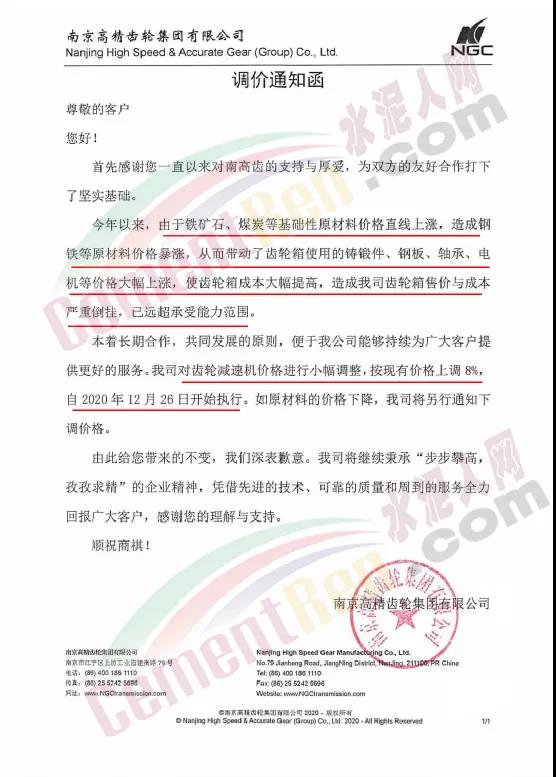 在剛剛過去的春節(jié)長假,大宗商品市場頗不平靜,油脂類產品也出現大幅的大調。南京高精齒輪集團有限公司調價通知稱,今年以來,由于鐵礦石、煤炭等基礎性原材料價格直線上漲,造成鋼鐵等原材料價格暴漲,從而帶動了齒輪箱使用的鑄鍛件、鋼板、軸承、電機等價格大幅上漲,使齒輪箱成本大幅提高,造成公司齒輪箱售價與成本嚴重倒掛,已遠超承受能力范圍。本著長期合作,共同發(fā)展的原則,便于公司能夠持續(xù)為廣大客戶提供更好的服務。對齒輪減速機價格進行小幅調整,按現有價格上調8%,自2020年12月26日開始執(zhí)行。如原材料的價格下降,將另行通知下調價格。