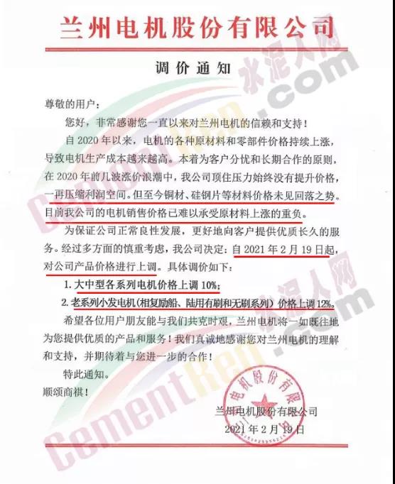 重慶賽力盟電機有限責任公司通知,兩個月以來,電機原輔材料價格繼續(xù)上漲,銅線、矽鋼片等主材價格創(chuàng)歷史新高,遠超公司預期,今后還會持續(xù)上漲并高位運行較長時間,公司現行產品售價出現較大虧損。為了維持企業(yè)正常經營和為客戶提供持久優(yōu)質的產品和服務,決定從2021年2月18日起調整產品售價,小電機上調8個百分點、中電機和發(fā)電機等其他產品上調7個百分點。