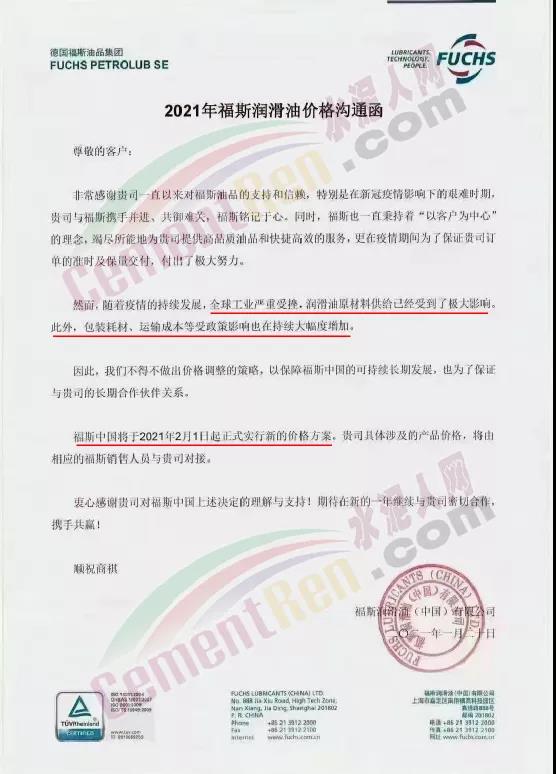 德國福斯油品集團2021年福斯?jié)櫥蛢r格溝通函提到,隨著疫情的持續(xù)發(fā)展,全球工業(yè)嚴重受挫,潤滑油原材料供給已經受到了極大影響。此外,包裝耗材、運輸成本等受政策影響也在持續(xù)大幅度增加。福斯中國將于2021年2月1日起正式實行新的價格方案。