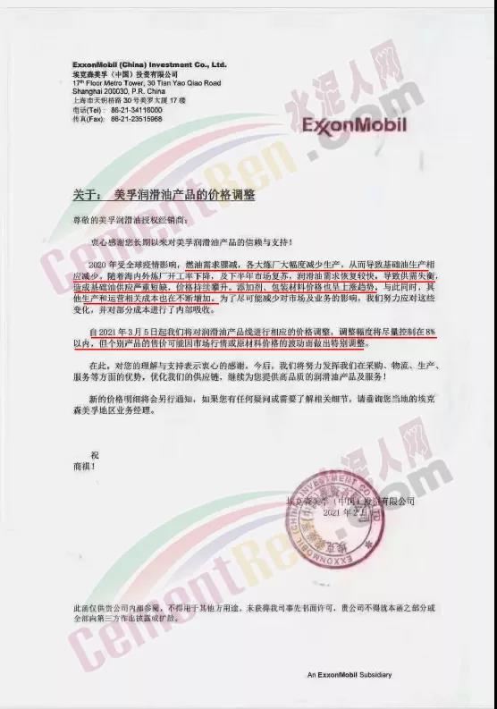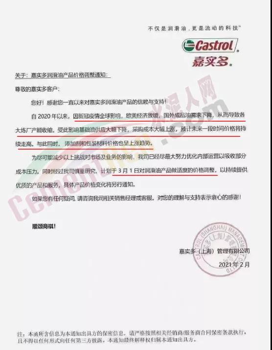 為了盡可能減少對市場及業(yè)務的影響,企業(yè)努力應對這些變化,并對部分成本進行了內部吸收。自2021年3月5日起將對潤滑油產品線進行相應的價格調整,調整幅度將盡量控制在8%以內,但個別產品的售價可能因市場行情或原材料價格的波動而做出特別調整。