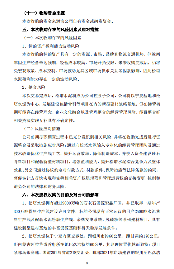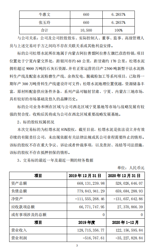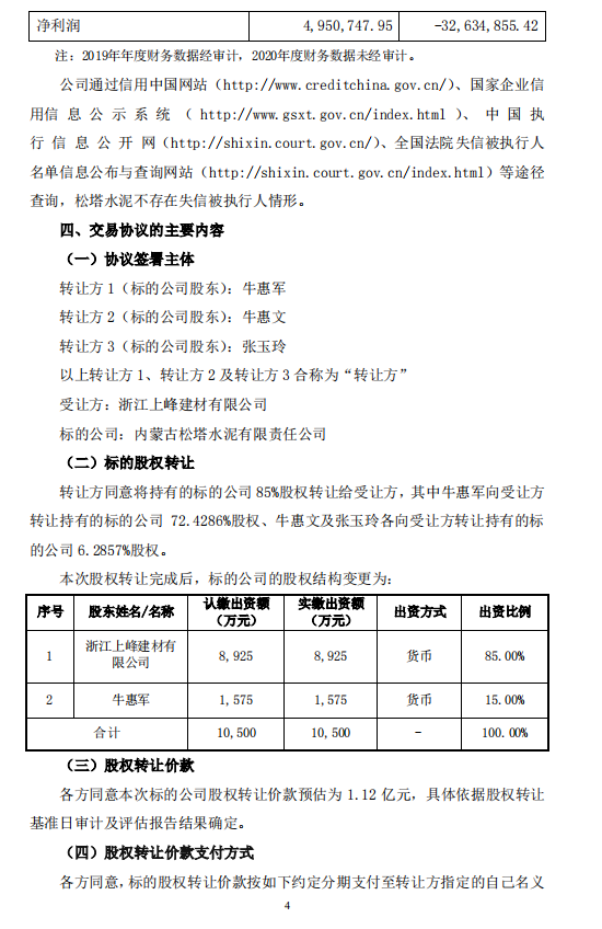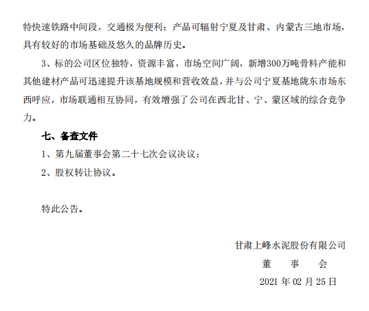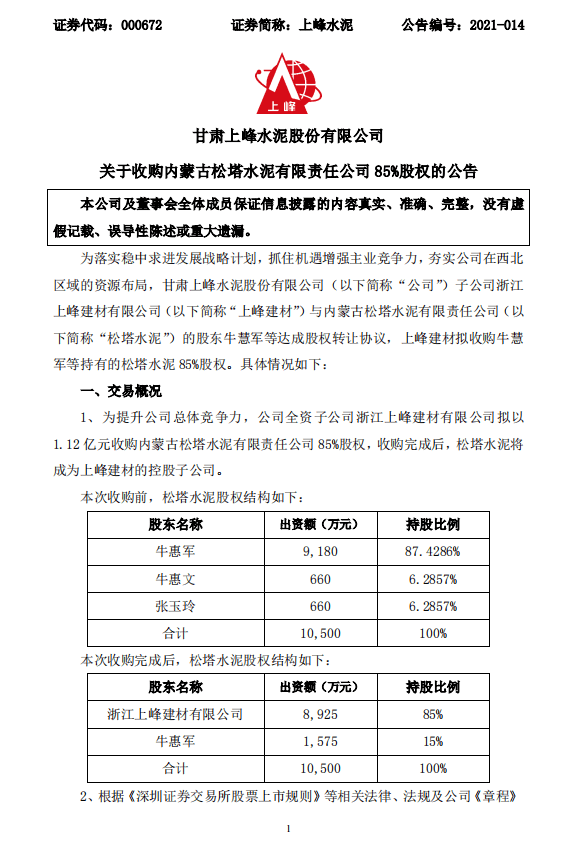 上峰水泥2月25日晚間發(fā)布公告稱,為落實穩(wěn)中求進發(fā)展戰(zhàn)略計劃,抓住機遇增強主業(yè)競爭力,夯實公司在西北區(qū)域的資源布局,甘肅上峰水泥股份有限公司子公司浙江上峰建材有限公司與內(nèi)蒙古松塔水泥有限責(zé)任公司的股東?;圮姷冗_成股權(quán)轉(zhuǎn)讓協(xié)議,上峰建材擬以1.12 億元收購?;圮姷瘸钟械膬?nèi)蒙古松塔水泥有限責(zé)任公司85%股權(quán)。