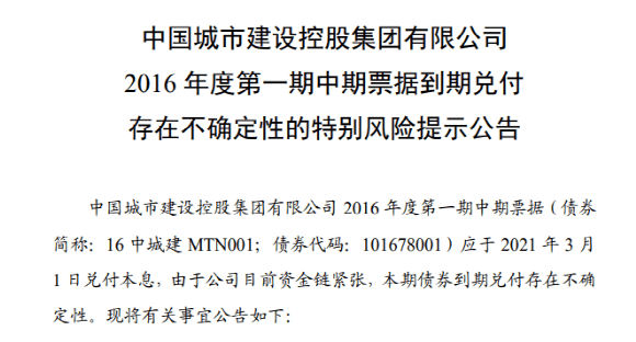 日前,中國城市建設(shè)控股集團有限公司(簡稱“中城建”)發(fā)布提示公告,“16中城建MTN001”債券于2021年3月1日到期,因資金鏈緊張存在不能兌付的可能性,而從發(fā)行之日起,該筆債權(quán)幾乎從未按時兌付,已構(gòu)成多次實質(zhì)性違約,此次違約將大概率出現(xiàn)。債權(quán)人稱中城建名下已無資產(chǎn),而多年來中城建遍尋合作方未果。