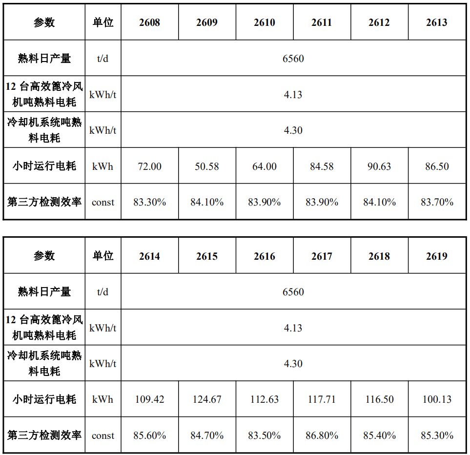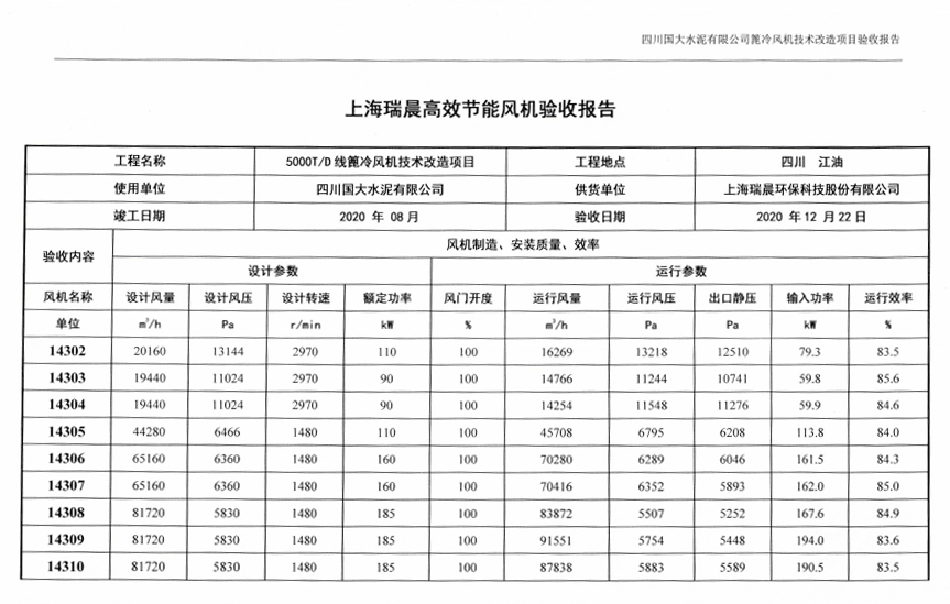 經(jīng)瑞晨環(huán)保改造后,四川國(guó)大12臺(tái)高效篦冷風(fēng)機(jī)F1-14302~F12-14313運(yùn)行穩(wěn)定,經(jīng)過(guò)第三方(綿陽(yáng)旗諾)標(biāo)定,運(yùn)行效率分別高達(dá)83.50%、85.60%、84.60%、84.00%、84.30%、85.00%、84.90%、83.60%、83.50%、85.00%、86.00%、83.80%。熟料提產(chǎn)至6589t/d后,12臺(tái)高效篦冷風(fēng)機(jī)噸熟料電耗降低至4.36kWh/t,篦冷機(jī)系統(tǒng)熟料電耗降低至4.51kWh/t滿足技術(shù)合同約定的噸熟料電耗≤4.93kWh/t。