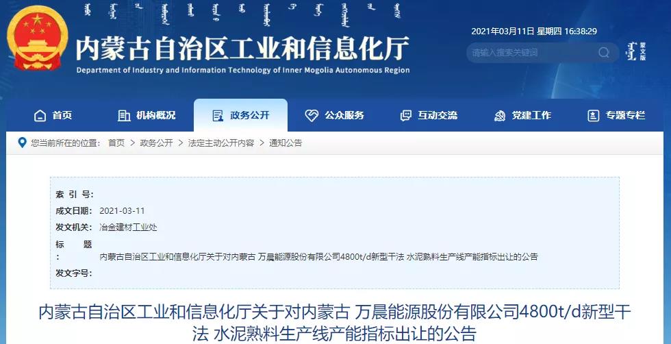 內(nèi)蒙古工信廳發(fā)布《關(guān)于內(nèi)蒙古萬(wàn)晨能源股份有限公司4800t/d新型干法 水泥熟料生產(chǎn)線產(chǎn)能指標(biāo)出讓的公告》將位于內(nèi)蒙古自治區(qū)境內(nèi)萬(wàn)晨能源股份有限公司4800t/d新型干法水泥熟料生產(chǎn)線產(chǎn)能指標(biāo)出讓。
