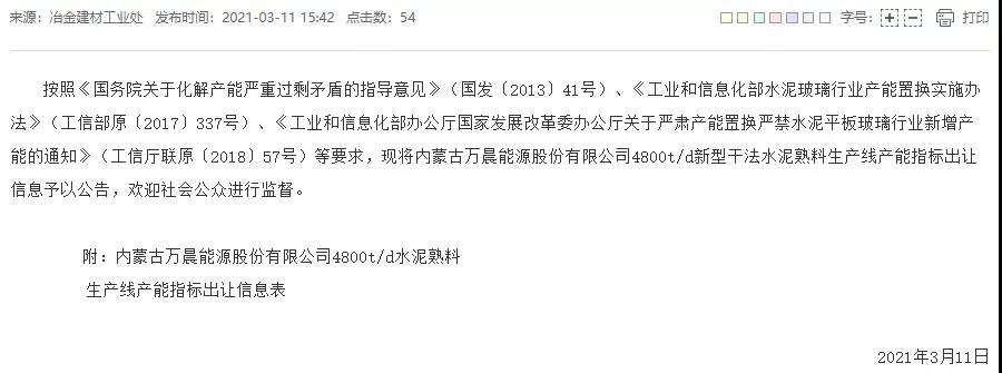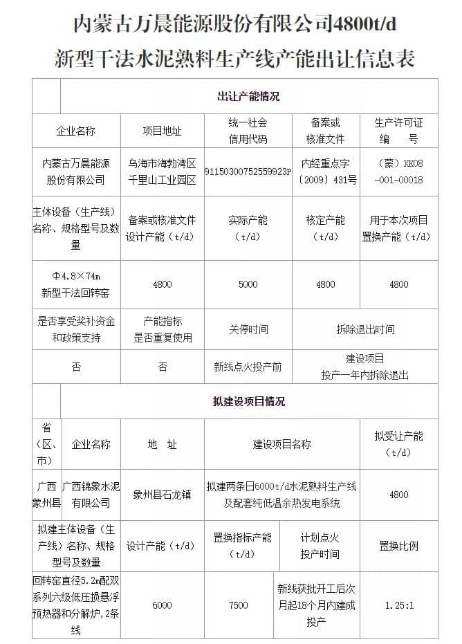 內(nèi)蒙古萬(wàn)晨能源股份有限公司4800t/d熟料生產(chǎn)線產(chǎn)能指標(biāo)出讓
