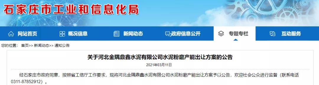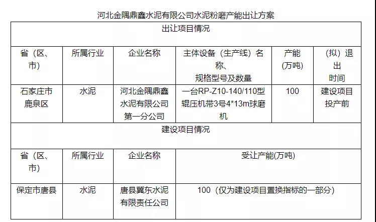 同期,河北省石家莊市工業(yè)和信息化局發(fā)布《關(guān)于河北金隅鼎鑫水泥有限公司粉磨產(chǎn)能出讓方案的公告》,出讓方案顯示河北金隅鼎鑫水泥有限公司將退出100萬(wàn)噸/年粉磨產(chǎn)能,用于唐縣冀東水泥有限責(zé)任公司建設(shè)新線。