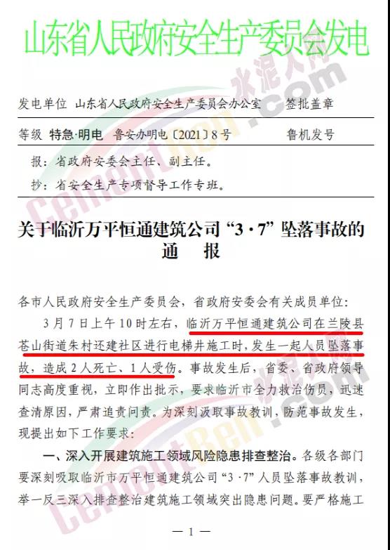 日前,山東省政府安委會(huì)發(fā)特急明電《關(guān)于臨沂萬平恒通建筑公司“3·7”墜落事故的通報(bào)》稱,3月7日上午10時(shí)左右,臨沂萬平恒通建筑公司在蘭陵縣蒼山街道朱村還建社區(qū)進(jìn)行電梯井施工時(shí),發(fā)生一起人員墜落事故,造成2人死亡、1人受傷。