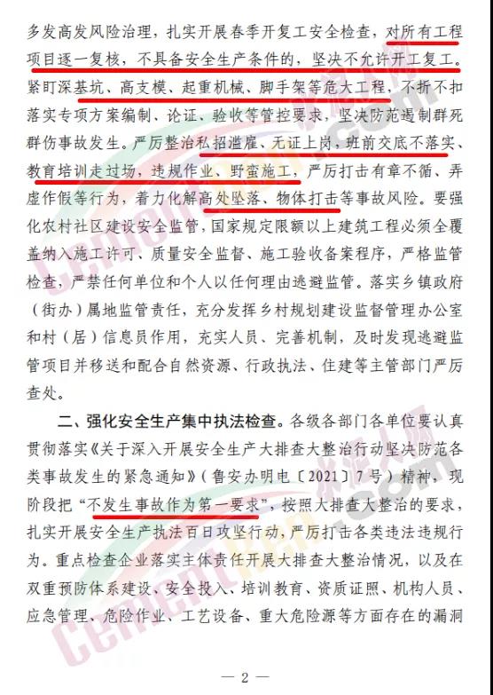 同時(shí),強(qiáng)化安全生產(chǎn)集中執(zhí)法檢查。各級(jí)各部門各單位要認(rèn)真貫徹落實(shí)《關(guān)于深入開展安全生產(chǎn)大排查大整治行動(dòng)堅(jiān)決防范各類事故發(fā)生的緊急通知》(魯安辦明電〔2021〕7號(hào))精神,現(xiàn)階段把“不發(fā)生事故作為第一要求”,按照大排查大整治的要求,扎實(shí)開展安全生產(chǎn)執(zhí)法百日攻堅(jiān)行動(dòng),嚴(yán)厲打擊各類違法違規(guī)行為。